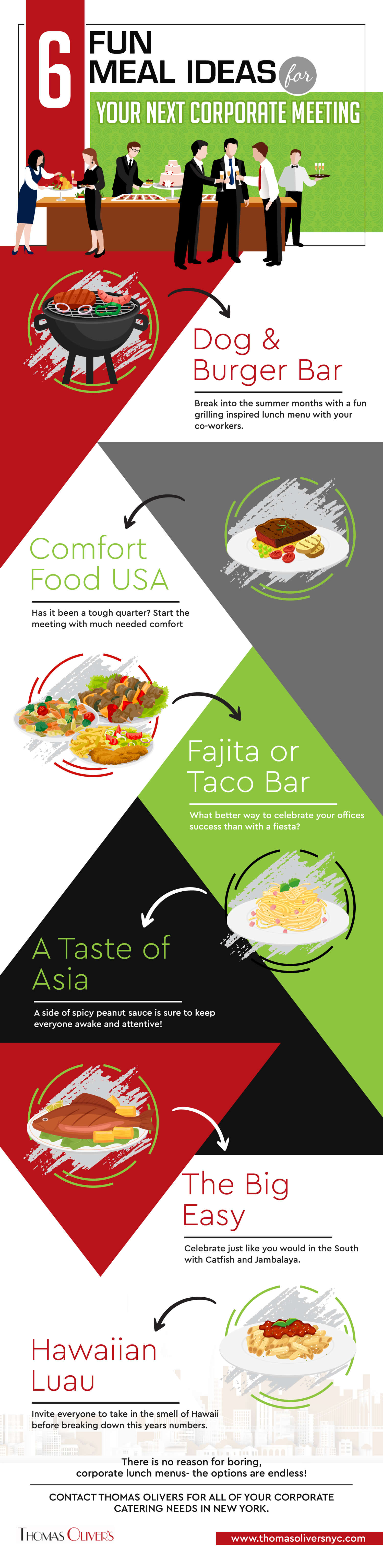 The infographic shows 6 fun meal ideas for your next corporate meeting.