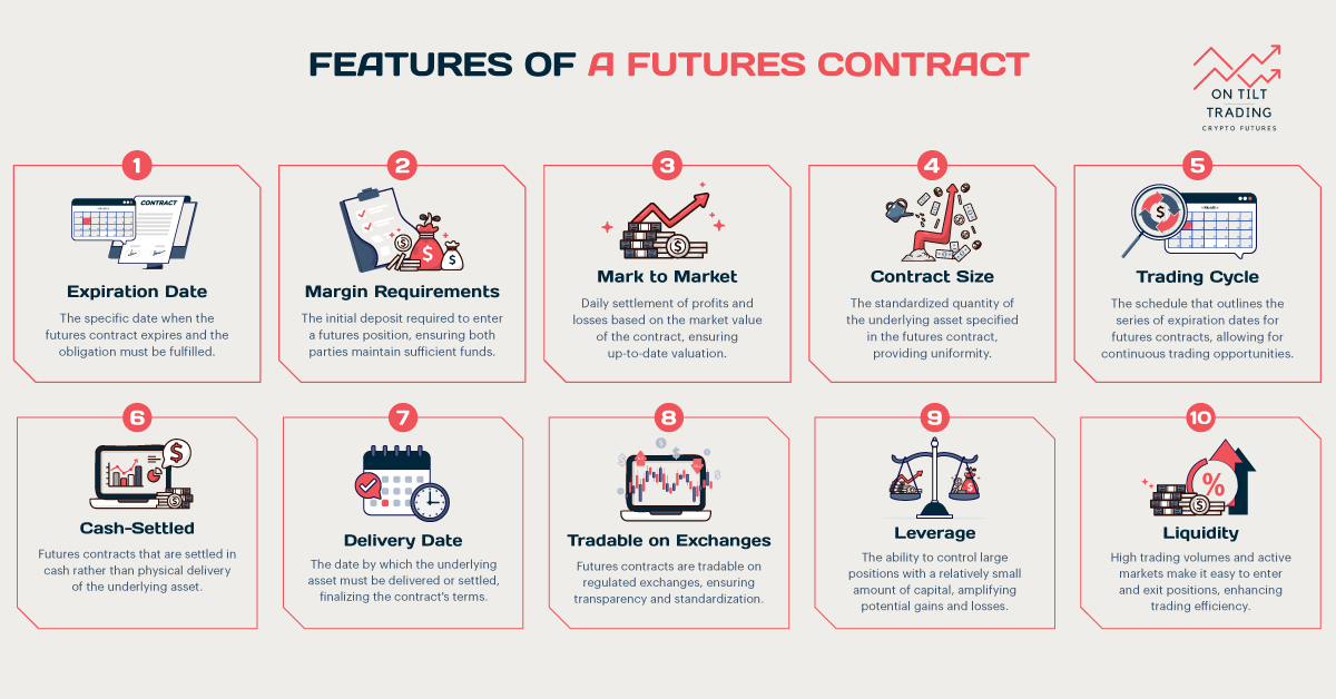 The infographic also highlights margin requirements, marking-to-market, and the role of leverage in futures trading. With clear visuals and concise descriptions, it illustrates how futures contracts function in the financial markets, detailing their benefits and risks.
