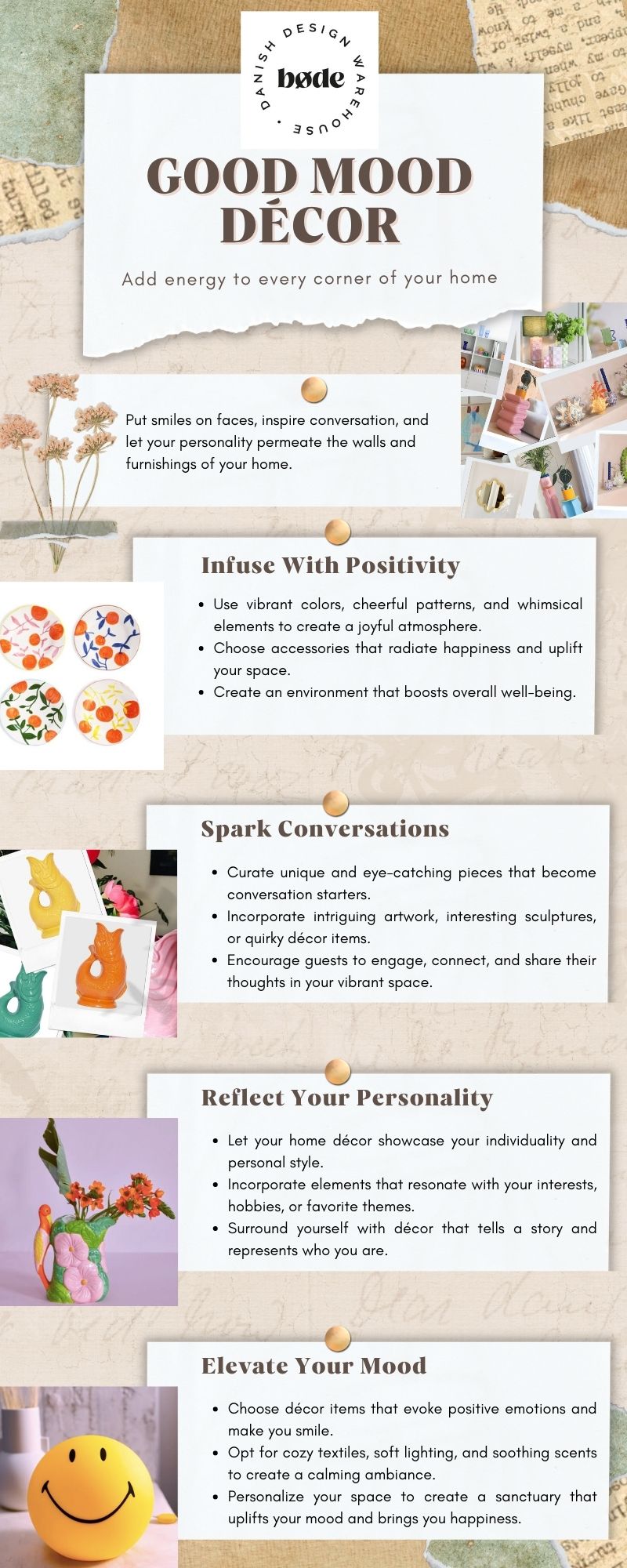 Elevate your home with GOOD MOOD DÉCOR: This infographic by Bøde Living shows how you can bring vibrant energy into every corner.
