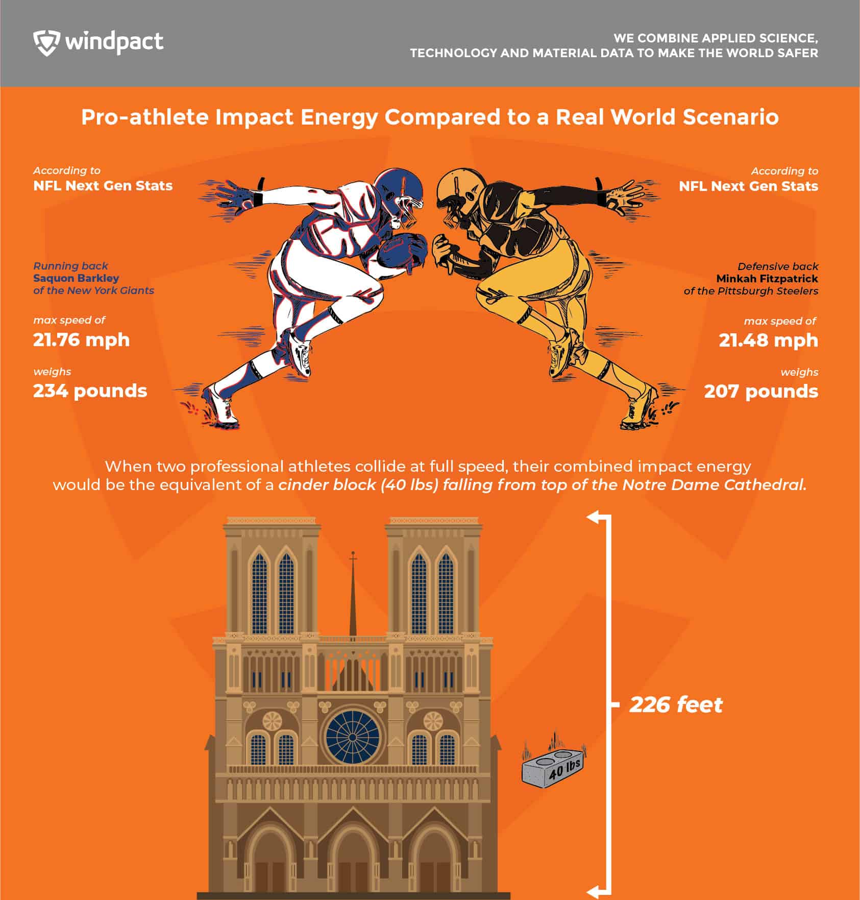 When these two athletes collide, their combined impact energy is nearly identical to a 40 lbs cinder block falling from the top of Notre Dame in Paris (226 ft in the air). This is due to how energy is calculated in terms of mass and velocity; no matter who or what is colliding, if the factors underlying the resulting energy transference are similar, then the forces at play in both scenarios are mathematically comparable.