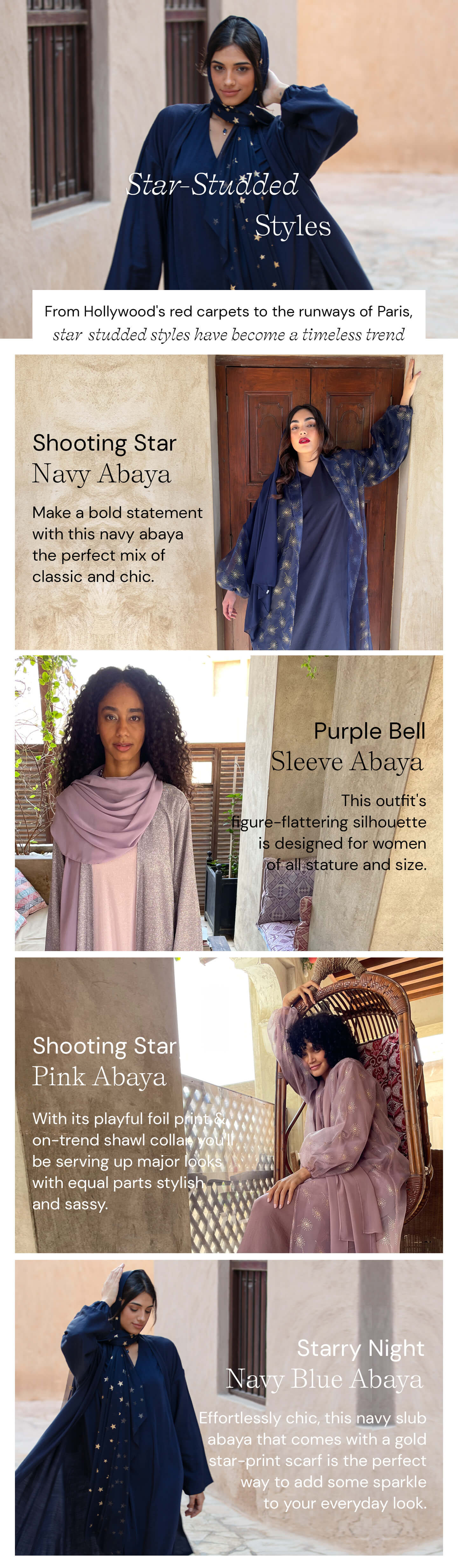 Embrace the ethereal Shooting Star Navy Abaya, exude elegance in the Purple Bell Sleeve Abaya, radiate charm with the Shooting Star Pink Abaya, and captivate the night in the Starry Night Navy Blue Abaya.