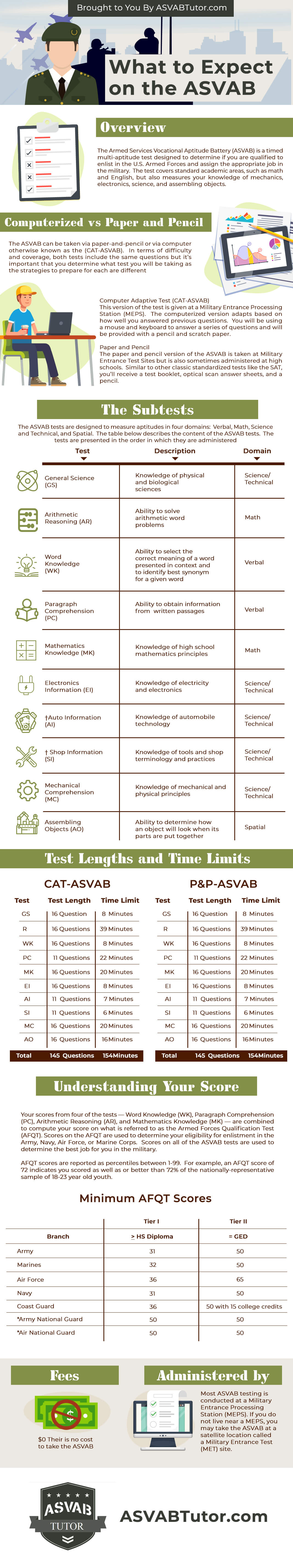 With this digestible but detailed infographic, individuals looking to join the United States Armed Forces can quickly get an idea of the testing requirements, subtests, format, and time limits before sitting for the exam.